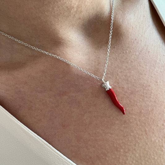 Pendente oro bianco con cornetto smalto rosso e brillanti