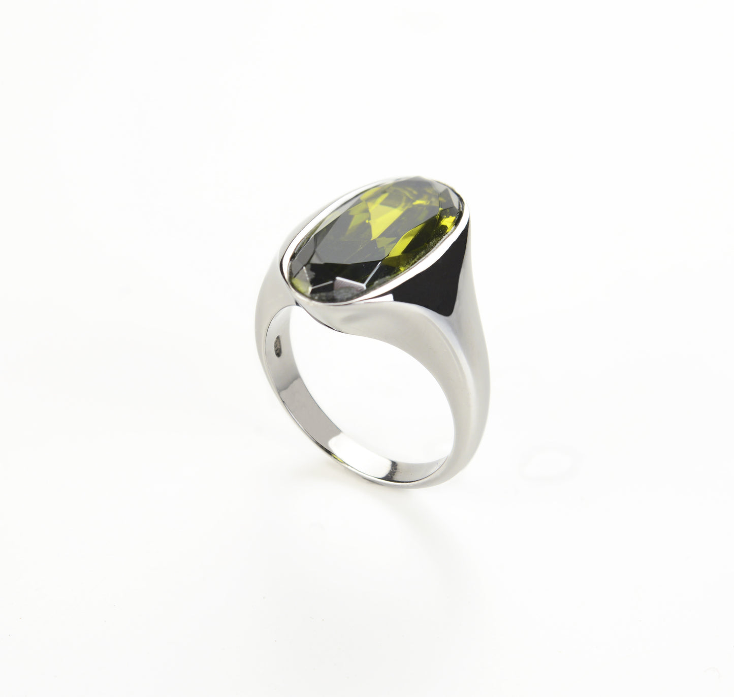 Elegant and precious silver ring with oval green zircon, to be worn on the pinky or ring finger.